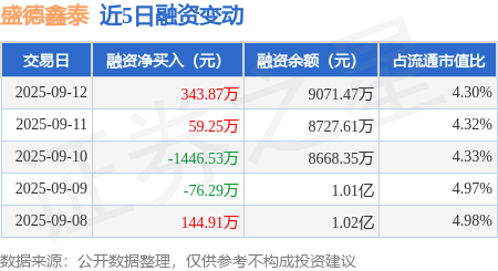 证券之星消息,9月12日,盛德鑫泰(300881)融资买入1561.93万元,融资偿还1218.07万元,融资净买入343.87万元,融资余额9071.47万元。