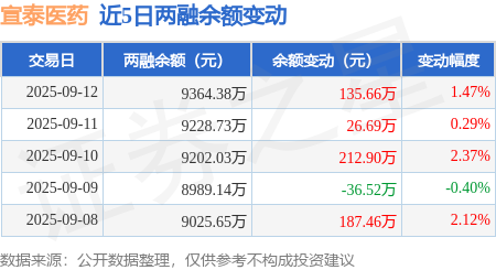 证券之星消息,9月12日,宣泰医药(688247)融资买入1055.0万元,融资偿还919.35万元,融资净买入135.66万元,融资余额9364.38万元,近3个交易日已连续净买入累计375.25万元,近20个交易日中有12个交易日出现融资净买入。
