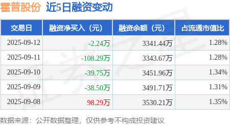 证券之星消息,9月12日,霍普股份(301024)融资买入341.62万元,融资偿还343.86万元,融资净卖出2.24万元,融资余额3341.44万元。