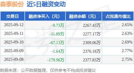 证券之星消息,9月12日,森泰股份(301429)融资买入104.84万元,融资偿还114.58万元,融资净卖出9.73万元,融资余额2267.43万元。