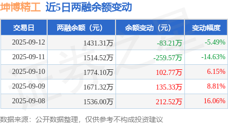 证券之星消息,9月12日,坤博精工(873570)融资买入296.9万元,融资偿还380.11万元,融资净卖出83.21万元,融资余额1431.31万元。