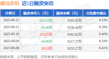 证券之星消息,9月12日,威马农机(301533)融资买入709.77万元,融资偿还862.29万元,融资净卖出152.52万元,融资余额9183.92万元。