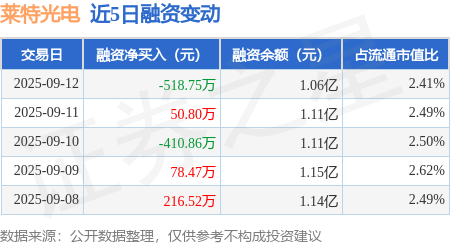 证券之星消息,9月12日,莱特光电(688150)融资买入1136.29万元,融资偿还1655.05万元,融资净卖出518.75万元,融资余额1.06亿元,近20个交易日中有11个交易日出现融资净买入。