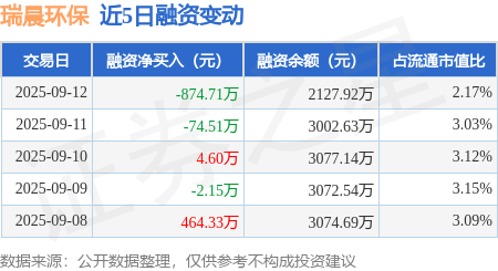证券之星消息,9月12日,瑞晨环保(301273)融资买入83.59万元,融资偿还958.3万元,融资净卖出874.71万元,融资余额2127.92万元。