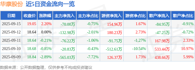 证券之星消息,截至2025年9月15日收盘,华康股份(605077)报收于19.05元,上涨2.2%,换手率1.64%,成交量4.9万手,成交额9288.89万元。