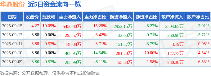 证券之星消息,华鼎股份9月15日涨停收盘,收盘价4.27元。该股于10点19分涨停,未打开涨停,截止收盘封单资金为2928.66万元,占其流通市值0.62%。