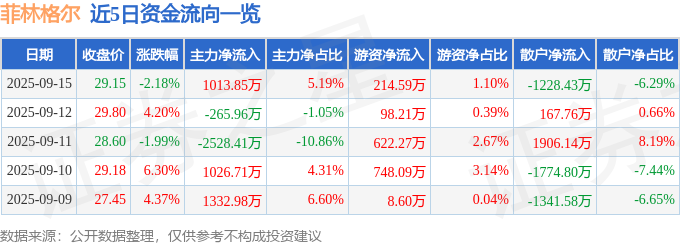证券之星消息,截至2025年9月15日收盘,菲林格尔(603226)报收于29.15元,下跌2.18%,换手率1.88%,成交量6.69万手,成交额1.95亿元。