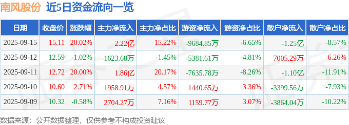 证券之星消息,截至2025年9月15日收盘,南风股份(300004)报收于15.11元,上涨20.02%,涨停,换手率22.4%,成交量107.52万手,成交额14.57亿元。