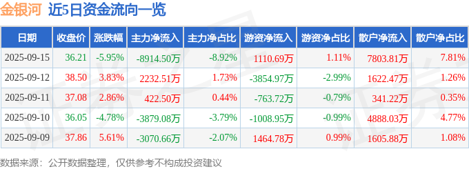 证券之星消息,截至2025年9月15日收盘,金银河(300619)报收于36.21元,下跌5.95%,换手率18.2%,成交量26.48万手,成交额9.99亿元。