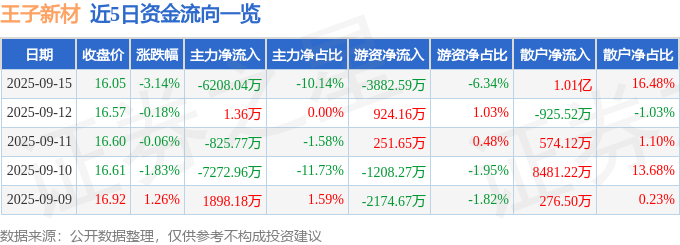 证券之星消息,截至2025年9月15日收盘,王子新材(002735)报收于16.05元,下跌3.14%,换手率13.48%,成交量37.81万手,成交额6.12亿元。