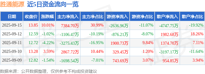 证券之星消息,胜通能源9月15日涨停收盘,收盘价13.85元。该股于11点17分涨停,未打开涨停,截止收盘封单资金为1.39亿元,占其流通市值5.99%。