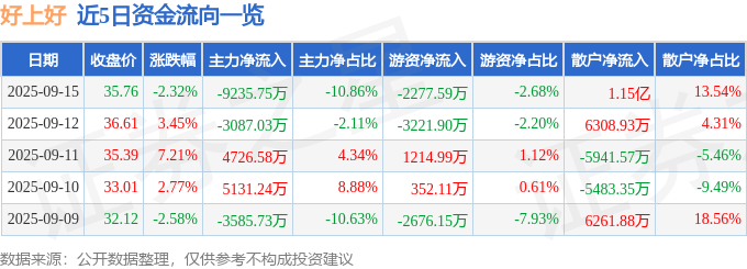 证券之星消息,截至2025年9月15日收盘,好上好(001298)报收于35.76元,下跌2.32%,换手率15.33%,成交量23.62万手,成交额8.5亿元。
