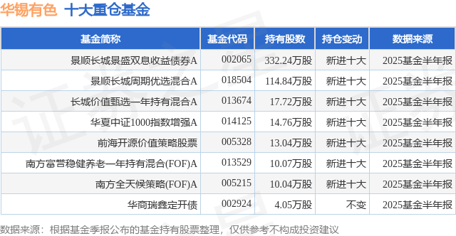 根据2025基金半年报公募基金重仓股数据,重仓该股的公募基金共8家,其中持有数量最多的公募基金为景顺长城基金的景顺长城景盛双息收益债券A。景顺长城景盛双息收益债券A目前规模为105.57亿元,最新净值1.212(9月12日),较上一交易日上涨0.17%,近一年上涨12.01%。该公募基金现任基金经理为李怡文 邹立虎 李曾卓卓。李怡文在任的基金产品包括:景顺长城景颐双利债券A,管理时间为2021年4月30日至今,期间收益率为22.85%;景顺景颐招利6个月持有期债券A,管理时间为2021年4月30日至今,期间收益率为31.5%;景顺长城安泽回报一年持有混合A,管理时间为2021年4月30日至今,期间收益率为37.92%;景顺景颐嘉利6个月持有期债券A,管理时间为2021年6月16日至今,期间收益率为20.89%。邹立虎在任的基金产品包括:景顺长城安盈回报一年持有混合A,管理时间为2021年11月16日至今,期间收益率为37.48%;景顺景颐招利6个月持有期债券A,管理时间为2022年3月12日至今,期间收益率为24.05%;景顺长城华城稳健6个月持有期混合A,管理时间为2022年3月12日至今,期间收益率为26.74%。