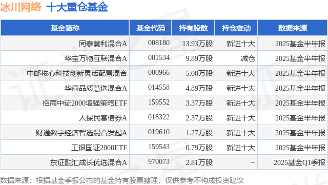 根据2025基金半年报公募基金重仓股数据,重仓该股的公募基金共8家,其中持有数量最多的公募基金为同泰基金的同泰慧利混合A。同泰慧利混合A目前规模为0.3亿元,最新净值1.3243(9月12日),较上一交易日下跌1.19%,近一年上涨48.73%。该公募基金现任基金经理为陈宗超 麦健沛。陈宗超在任的基金产品包括:同泰数字经济股票A,管理时间为2021年7月27日至今,期间收益率为11.06%;同泰行业优选股票A,管理时间为2023年4月7日至今,期间收益率为-23.14%;同泰新能源1年持有股票A,管理时间为2025年5月12日至今,期间收益率为19.21%。麦健沛在任的基金产品包括:同泰慧择混合A,管理时间为2025年5月12日至今,期间收益率为10.8%;同泰大健康主题混合A,管理时间为2025年5月12日至今,期间收益率为23.36%;同泰行业优选股票A,管理时间为2025年5月12日至今,期间收益率为6.29%;