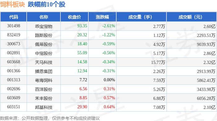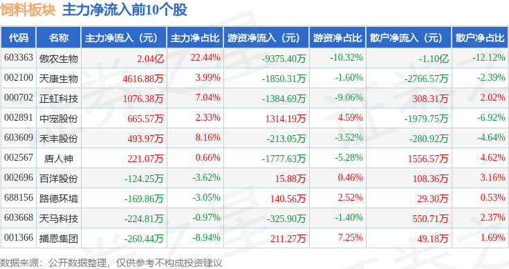 从资金流向上来看,当日饲料板块主力资金净流入1.16亿元,游资资金净流出6801.95万元,散户资金净流出4777.61万元。饲料板块个股资金流向见下表: