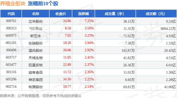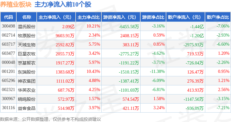 从资金流向上来看,当日养殖业板块主力资金净流入2.4亿元,游资资金净流出2329.65万元,散户资金净流出2.17亿元。养殖业板块个股资金流向见下表:
