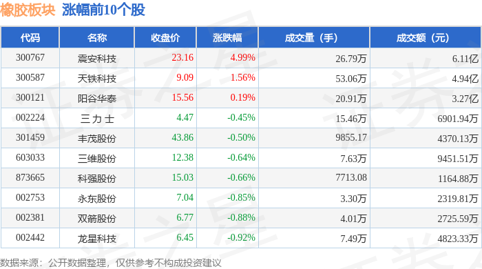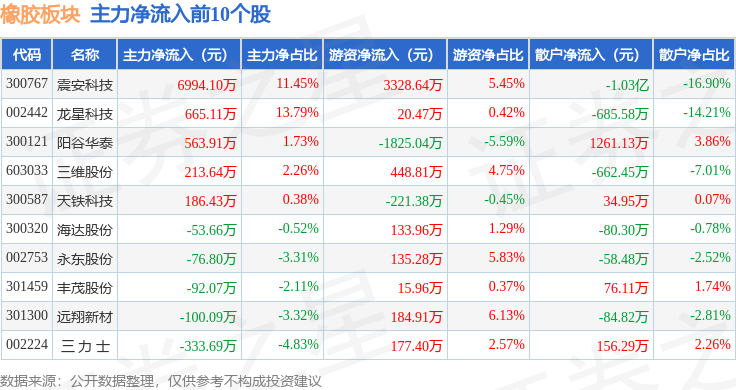从资金流向上来看,当日橡胶板块主力资金净流出3980.61万元,游资资金净流入4492.83万元,散户资金净流出512.23万元。橡胶板块个股资金流向见下表: