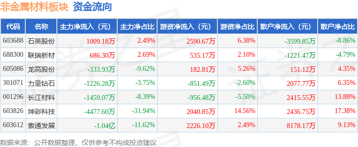从资金流向上来看,当日非金属材料板块主力资金净流出1.62亿元,游资资金净流入5767.63万元,散户资金净流入1.04亿元。非金属材料板块个股资金流向见下表: