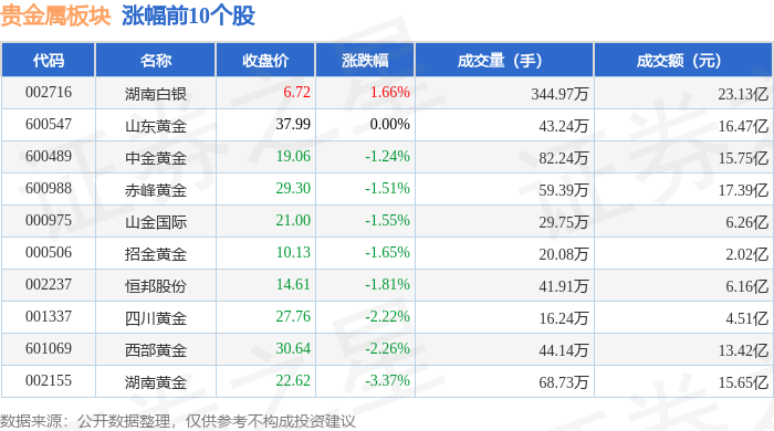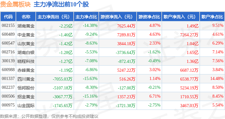 从资金流向上来看,当日贵金属板块主力资金净流出10.74亿元,游资资金净流入1.87亿元,散户资金净流入8.87亿元。贵金属板块个股资金流向见下表: