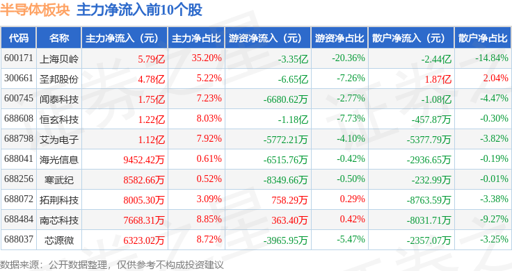 从资金流向上来看,当日半导体板块主力资金净流出45.62亿元,游资资金净流入20.27亿元,散户资金净流入25.35亿元。半导体板块个股资金流向见下表: