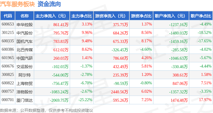 从资金流向上来看,当日汽车服务板块主力资金净流出1242.42万元,游资资金净流入5808.6万元,散户资金净流出4566.18万元。汽车服务板块个股资金流向见下表: