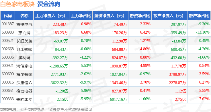 从资金流向上来看,当日白色家电板块主力资金净流出4.13亿元,游资资金净流出1908.6万元,散户资金净流入4.32亿元。白色家电板块个股资金流向见下表: