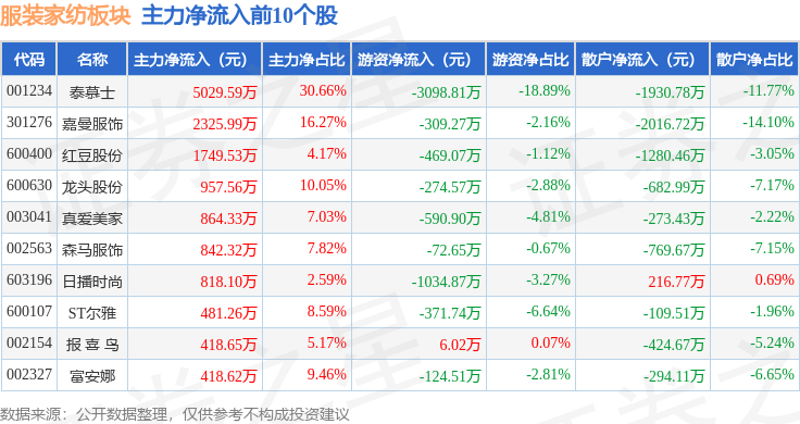 从资金流向上来看,当日服装家纺板块主力资金净流出2.26亿元,游资资金净流出9691.84万元,散户资金净流入3.23亿元。服装家纺板块个股资金流向见下表: