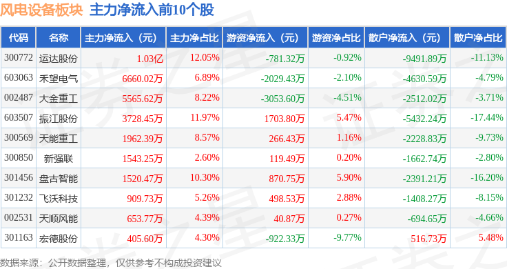 从资金流向上来看,当日风电设备板块主力资金净流入4278.49万元,游资资金净流入1.21亿元,散户资金净流出1.64亿元。风电设备板块个股资金流向见下表: