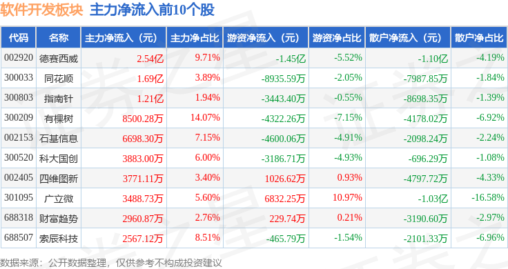 从资金流向上来看,当日软件开发板块主力资金净流出23.36亿元,游资资金净流入3.5亿元,散户资金净流入19.87亿元。软件开发板块个股资金流向见下表: