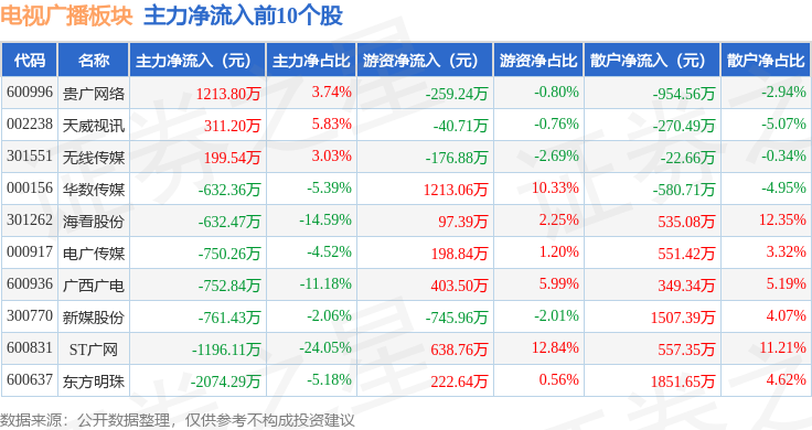 从资金流向上来看,当日电视广播板块主力资金净流出5.34亿元,游资资金净流入2447.24万元,散户资金净流入5.09亿元。电视广播板块个股资金流向见下表: