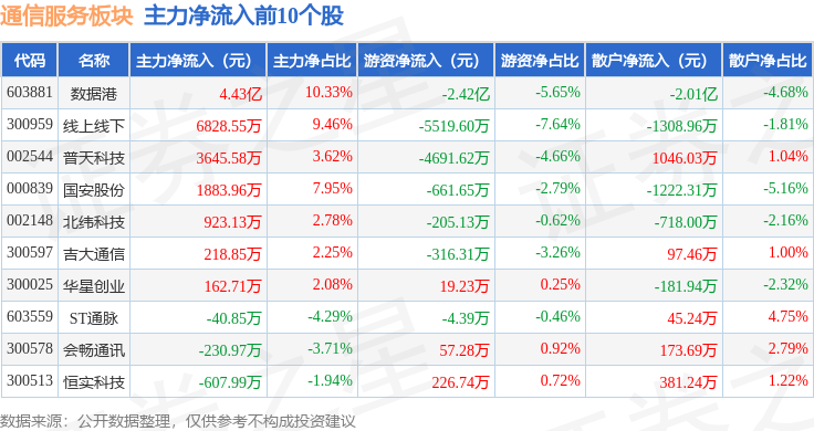 从资金流向上来看,当日通信服务板块主力资金净流出9.87亿元,游资资金净流出1.47亿元,散户资金净流入11.34亿元。通信服务板块个股资金流向见下表: