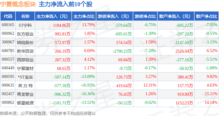 从资金流向上来看,当日宁夏概念板块主力资金净流出1.12亿元,游资资金净流入471.51万元,散户资金净流入1.08亿元。宁夏概念板块个股资金流向见下表: