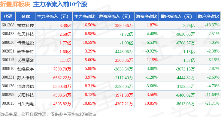 从资金流向上来看,当日折叠屏板块主力资金净流出15.18亿元,游资资金净流入3.73亿元,散户资金净流入11.45亿元。折叠屏板块个股资金流向见下表: