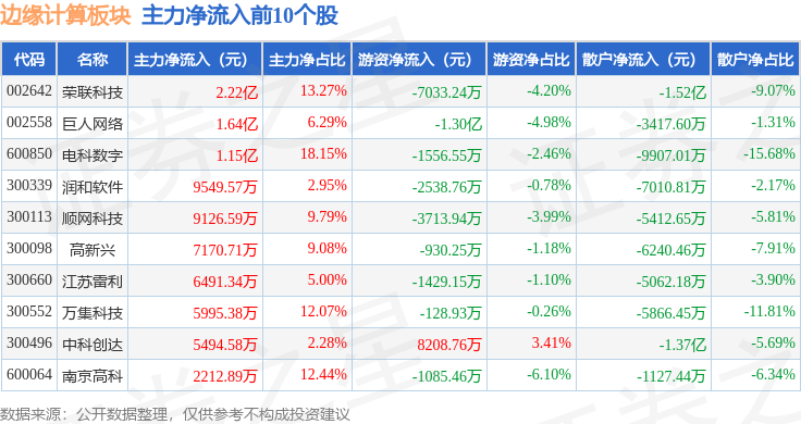 从资金流向上来看,当日边缘计算板块主力资金净流出26.77亿元,游资资金净流入7.49亿元,散户资金净流入19.28亿元。边缘计算板块个股资金流向见下表: