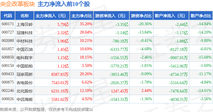 从资金流向上来看,当日央企改革板块主力资金净流出85.05亿元,游资资金净流入23.88亿元,散户资金净流入61.17亿元。央企改革板块个股资金流向见下表: