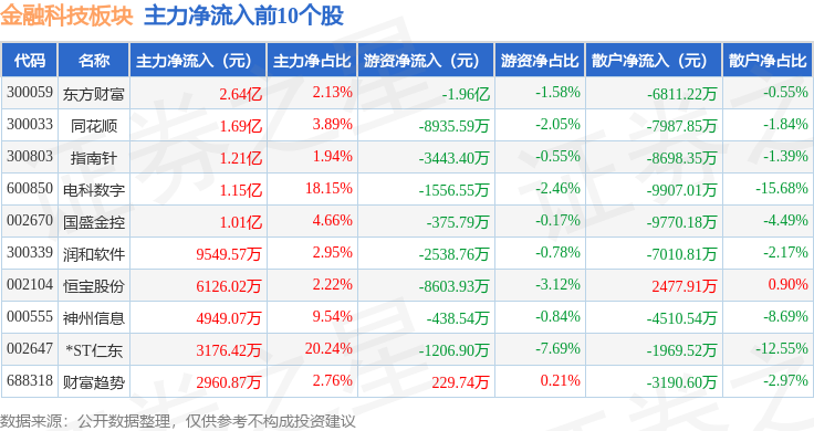 从资金流向上来看,当日金融科技板块主力资金净流出29.51亿元,游资资金净流入4.61亿元,散户资金净流入24.91亿元。金融科技板块个股资金流向见下表: