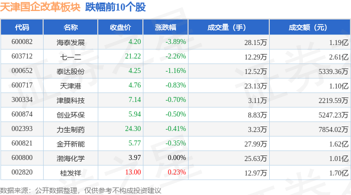 证券之星消息,9月15日天津国企改革板块较上一交易日下跌0.66%,海泰发展领跌。当日上证指数报收于3860.5,下跌0.26%。深证成指报收于13005.77,上涨0.63%。天津国企改革板块个股涨跌见下表: