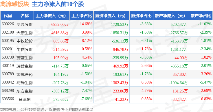 从资金流向上来看,当日禽流感板块主力资金净流入1.1亿元,游资资金净流出1390.2万元,散户资金净流出9572.13万元。禽流感板块个股资金流向见下表: