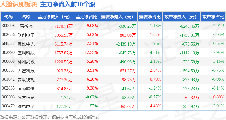 从资金流向上来看,当日人脸识别板块主力资金净流出13.34亿元,游资资金净流入2.37亿元,散户资金净流入10.97亿元。人脸识别板块个股资金流向见下表: