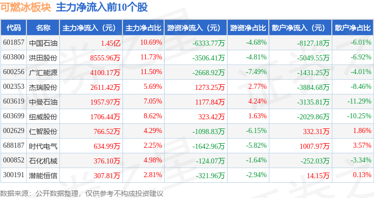 从资金流向上来看,当日可燃冰板块主力资金净流出1172.58万元,游资资金净流入4148.95万元,散户资金净流出2976.37万元。可燃冰板块个股资金流向见下表: