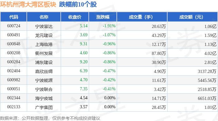从资金流向上来看,当日环杭州湾大湾区板块主力资金净流入1.56亿元,游资资金净流出7020.88万元,散户资金净流出8606.5万元。环杭州湾大湾区板块个股资金流向见下表: