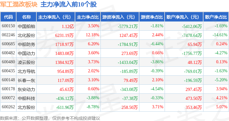 从资金流向上来看,当日军工混改板块主力资金净流出3.01亿元,游资资金净流入4667.4万元,散户资金净流入2.54亿元。军工混改板块个股资金流向见下表: