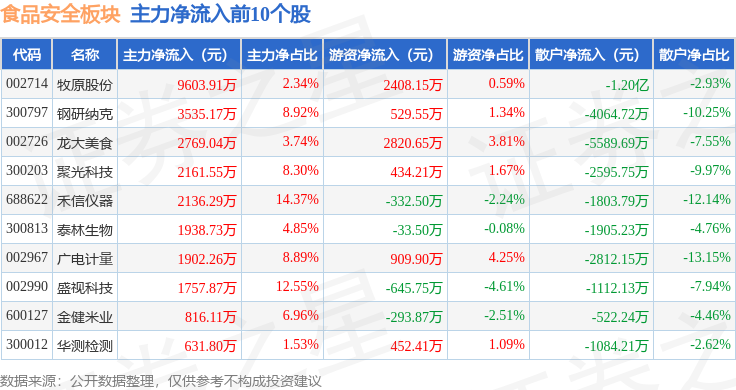 从资金流向上来看,当日食品安全板块主力资金净流出2.29亿元,游资资金净流入1.75亿元,散户资金净流入5424.28万元。食品安全板块个股资金流向见下表: