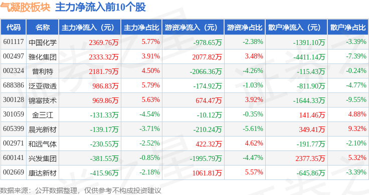 从资金流向上来看,当日气凝胶板块主力资金净流出3.87亿元,游资资金净流入1.2亿元,散户资金净流入2.67亿元。气凝胶板块个股资金流向见下表: