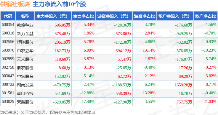 从资金流向上来看,当日供销社板块主力资金净流出1.99亿元,游资资金净流出3131.4万元,散户资金净流入2.3亿元。供销社板块个股资金流向见下表: