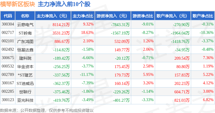 从资金流向上来看,当日横琴新区板块主力资金净流出2.75亿元,游资资金净流入3159.11万元,散户资金净流入2.43亿元。横琴新区板块个股资金流向见下表: