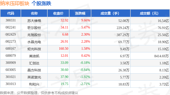 证券之星消息,9月15日纳米压印板块较上一交易日上涨3.31%,苏大维格领涨。当日上证指数报收于3860.5,下跌0.26%。深证成指报收于13005.77,上涨0.63%。纳米压印板块个股涨跌见下表: