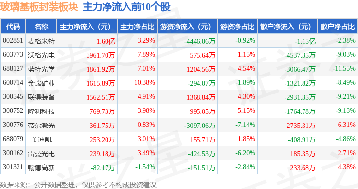 从资金流向上来看,当日玻璃基板封装板块主力资金净流出5.75亿元,游资资金净流入1.3亿元,散户资金净流入4.45亿元。玻璃基板封装板块个股资金流向见下表: