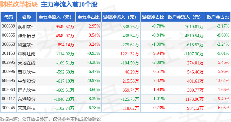从资金流向上来看,当日财税改革板块主力资金净流出10.66亿元,游资资金净流入1.47亿元,散户资金净流入9.19亿元。财税改革板块个股资金流向见下表: