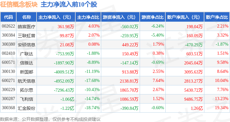 从资金流向上来看,当日征信概念板块主力资金净流出9.85亿元,游资资金净流入1.12亿元,散户资金净流入8.73亿元。征信概念板块个股资金流向见下表: